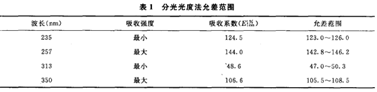 精密稱取在120℃干燥至恒重的基準重鉻酸鉀約60mg,置1000m1量瓶中,用0.005mo1L硫酸液溶解并稀釋至1000m1,用配對的1 cm石英池,以0.005mo1L硫酸液為空白,在235,257,313,350nm分別測定吸光度,然后換算成E,測得值應符合表1中規定的允差范圍。