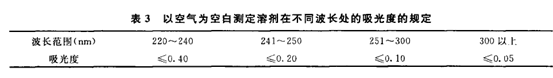 4.含有雜原子的有機溶劑,通常均具有很強的末端吸收。因此,當作溶劑使用時,它們的使用范圍均不能小于截止使用波長。例如甲醇、乙醇的截止使用波長為205nm。另外,當溶劑不純時,也可能增加干擾吸收。因此,在檢查所用的溶劑在供試品所用的波長附近是否符合要求,即將溶劑置1 cm石英吸收池中,以空氣為空白(即空白光路中不置任何物質)測定其吸光度,溶劑和吸收池的吸光度應符合表3規定。