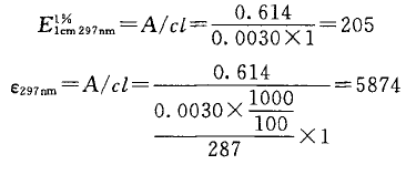 規定的吸收系數,系指E,即在指定波長時,光路長度為1 cm,試樣濃度換算為1%(gml)時的吸光度值,故應先求被測樣品的E值,再與規定的E標準值比較,可計算出供試樣品的含量。