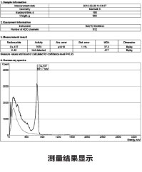 | 測量范圍 1L容器 131I 134Cs 137Cs 40K 226Ra 232Th 1L容器(0.5L樣品) 134Cs 137Cs 40K 0.5L容器 131I 134Cs 137Cs 40K 0.1L容器 131I 134Cs 137Cs 40K | 3-4·10 5 Bq/l 3-10 5 Bq/l 3.7-10 5 Bq/l 50-2·10 4 Bq/l 10-10 4 Bq/l 10-10 4 Bq/l 5-10 5 Bq/l 5-10 5 Bq/l 70-2·10 4 Bq/l 20-4·10 5 Bq/l 20-4·10 5 Bq/l 20-4·10 5 Bq/l 200-2·10 4 Bq/l 50-4·10 6 Bq/l 50-4·10 6 Bq/l 50-4·10 6 Bq/l 500-2·10 4 Bq/l |