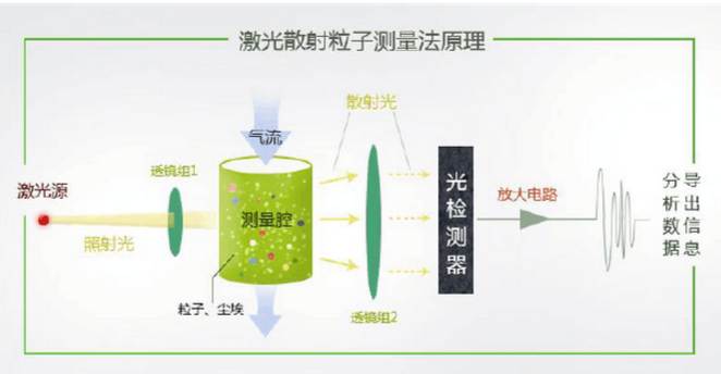 激光光散射粉塵儀通過采氣泵將待測氣溶膠吸入檢測艙,待測氣溶膠在分支處分流成為兩部分,一部分經(jīng)過一個(gè)高效過濾器后被過濾為干凈的空氣,作為保護(hù)鞘氣來保護(hù)傳感器室的元器件不受待測氣體污染。另一部分氣溶膠,作為待測樣品直接進(jìn)入傳感器室。 傳感器室中,主要元器件為激光二極管、透鏡組和光電檢測器。檢測時(shí),首先由激光二極管發(fā)出的激光,通過透鏡組形成一個(gè)薄層面光源。薄層光照射在流經(jīng)傳感器室的待測氣溶膠時(shí),會產(chǎn)生散射,通過光電探測器來檢測光的散射光強(qiáng)。光電探測器受光照之后產(chǎn)生電信號,正比于氣溶膠的質(zhì)量濃度。然后乘以電壓校準(zhǔn)系數(shù),這個(gè)系數(shù)通過測定特定濃度的氣溶膠來得到。