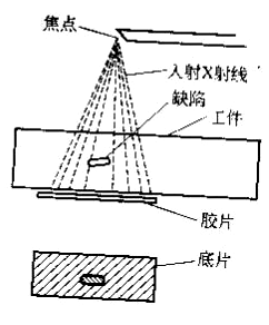 射線(xiàn)照相法是根據(jù)被檢工件與其內(nèi)部缺陷介質(zhì)對(duì)射線(xiàn)能量衰減程度的不同,使得射線(xiàn)透過(guò)工件后的強(qiáng)度不同,使缺陷能在射線(xiàn)底片上顯示出來(lái)的方法。如圖2所示,從X射線(xiàn)機(jī)發(fā)射出來(lái)的X射線(xiàn)透過(guò)工件時(shí),由于缺陷內(nèi)部介質(zhì)對(duì)射線(xiàn)的吸收能力和周?chē)旰貌课徊灰粯樱蚨高^(guò)缺陷部位的射線(xiàn)強(qiáng)度不同于周?chē)旰貌课弧0涯z片放在工件適當(dāng)位置,在感光膠片上,有缺陷部位和無(wú)缺陷部位將接受不同的射線(xiàn)曝光。再經(jīng)過(guò)暗室處理后,得到底片。然后把底片放在觀(guān)片燈上*可以明顯觀(guān)察到缺陷處和無(wú)缺陷處具有不同的黑度。評(píng)片人員據(jù)此*可以判斷缺陷的情況。